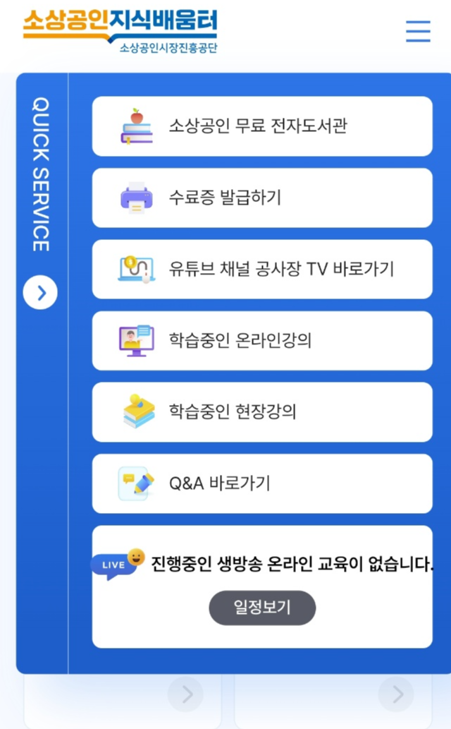 이해가 편하시도록 모바일버전으로 설명드려볼게요. 위 사진처럼 홈페이지로 가게 되면 창우 측에 퀵서비스라는 슬라이드 창이 나오게 되고 소상공인무료전자도서관을 누르게 되면 로그인하라고 나옵니다. 회원가입을 진행해 주셔야 해요.