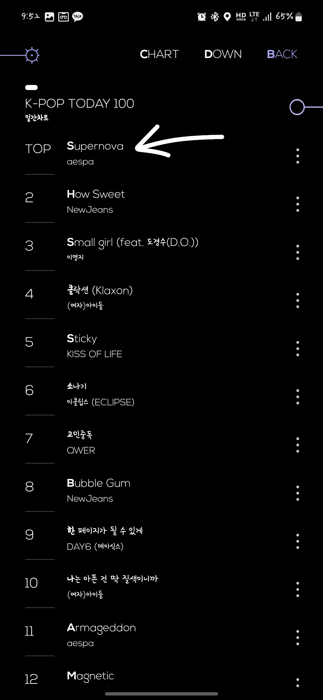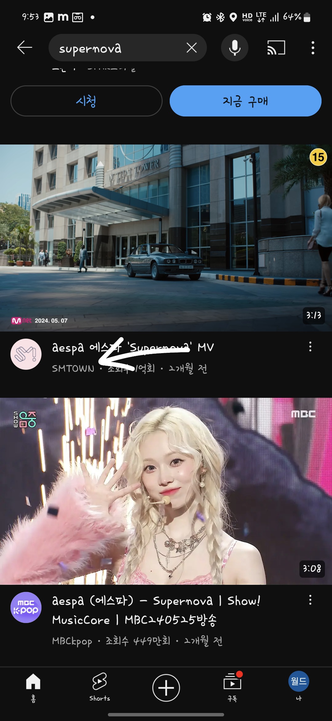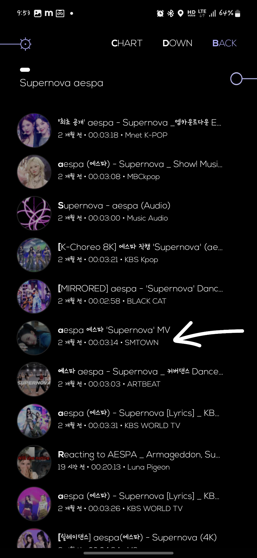 유튜브에서 supernova를 검색해 보니 소속사인 smtown에서 발행한 동영상이 나옵니다. 저음원이 가장 좋겠죠? 이것을 뮤직다운어플로 받으려면
