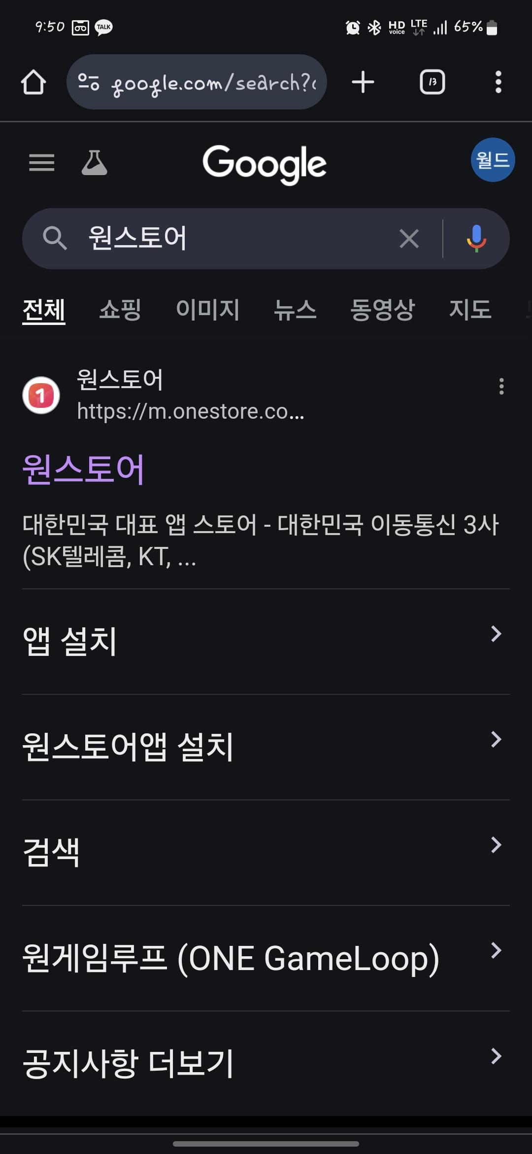 저는 구글로 검색하겠습니다. 구글검색창에 원스토어를 검색하시면 상단에 저렇게 나오게 됩니다. 그래서 눌러서 설치 진행!