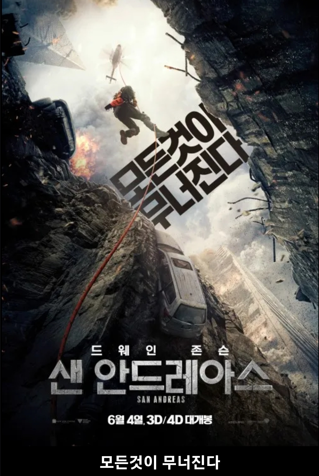 이영화는 2015년도 작품으로 전직 프로레슬러인 드웨인존슨과 제가 좋아하는 여배우 알렉산드라 다다리오가 나오는 재난영화입니다.
