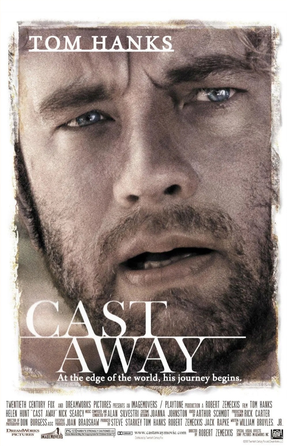 2000년에 만들어진 영화로 톰행크스의 1인 영화라고 해도 무방한 영화입니다. 설정은 엄청 바쁘게 출장이 잦은 톰행크스가 어느 날 출장비행 중 태평양 한가운데로 떨어지면서 정신을 잃고 간신히 구명보트 하나를 붙잡아 바다에 표류하고 정신을 깨어보니 웬 섬에 도착한 설정. 무인도에서 정신을 차린 톰은 생존자가 있는지 찾아보다 혼자인 것을 알아차리고 비행기 잔해 중 떠내려온 물류등을 뒤져 쓸만한 걸 찾게 됩니다. 실제 무인도에 남겨진다면이라는 설정하에 물류꾸러미등에서 나온 스케이트신발이나 드레스의 망사등을 이용해 칼과 그물로 만들어 쓰고 불이 필요한 그는 나무만을 이용해 불을 지피다 실패하기 일쑤였는데 다른 방법을 이용해 불지피기도 성공하고 맙니다.
